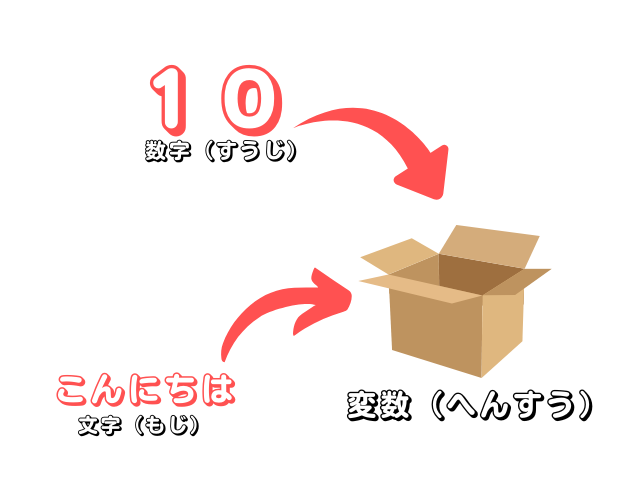 変数(へんすう)とはなんでも入れることができる「箱(はこ)」のようなものです。数字(すうじ)や文字(もじ)やいろいろな「データ」を入れることができます。この箱(はこ)に入れたデータは後で取り出したり変えたりすることができます。