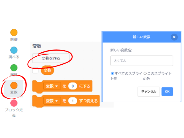 「とくてん」変数(へんすう)を作ったらプログラミングに入れていきましょう。