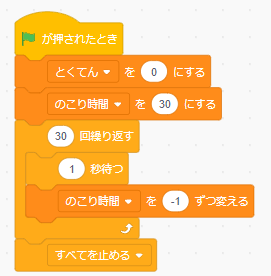 まず「のこり時間を30にする」とします。1秒に一回のこり時間を「-1」にして終わったら「すべてを止める」にします。