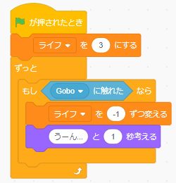 主人公のスプライトに新しく🚩が押されたときブロックを置いてその下にプログラムを作っていきましょう。最初にライフの設定をして、敵(てき)[Gobo]に触れたらライフを「-1」ずつ変えるようにします。
