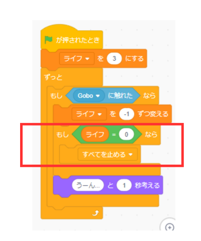 ライフを-1ずつ変えるの下に「もしライフ=0なら」「すべて止める」をいれましょう。「すべてを止める」はここでプログラムが終わる(ゲームが止まる」ようになります。