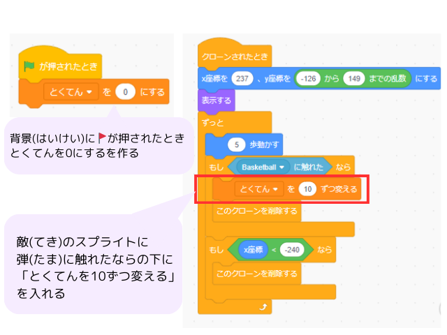 敵(てき)をたおしたら点数をふやす
